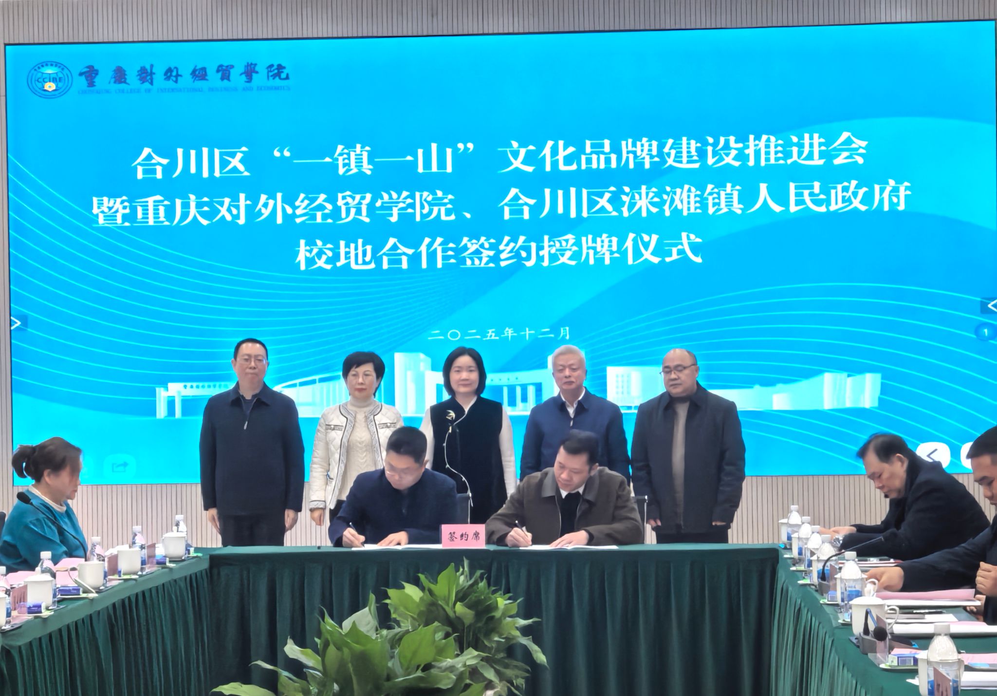 12月18日,合川区“一镇一山”文化品牌建设推进会暨重庆对外经贸学院与合川区涞滩镇人民政府校地合作签约授牌仪式在学校9106会议室成功举行。合川区委常委、统战部部长邓立,区政府副区长袁晓钦参加并发表讲话,校长孙泽平,党委书记、督导专员何大海,副校长李川出席仪式。