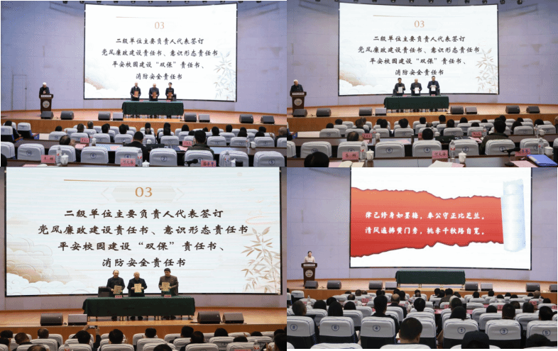 会上,党委书记何大海分别与二级单位主要负责人代表签订了《2025年党风廉政建设责任书》《2025年意识形态责任书》,校长孙泽平分别与二级单位主要负责人代表签订了《平安校园建设“双保”责任书》《消防安全责任书》,纪委副书记张远鹏回顾并总结了2024年学校全面从严治党工作,对2025年主要工作提出了四个方面的工作安排,参会人员集体观看了警示教育片。